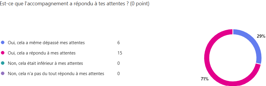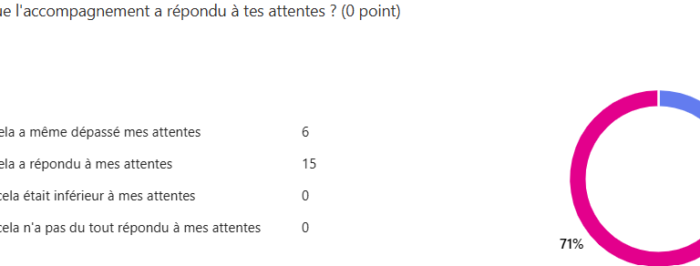 Ces résultats montrent que l'accompagnement est perçu comme très efficace, humain et structurant, avec une forte satisfaction et peu de suggestions d'amélioration.
